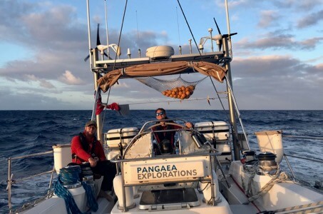 The skies are clearing and the sun is shining, and there are many more miles of ocean to go! (Below are Matt, Shanley, and our oranges)