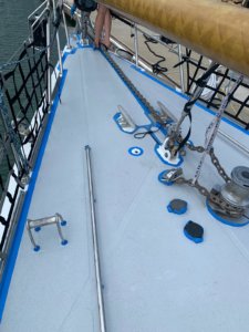 What better way to celebrate Earth day than to be fully emerged in mother nature herself. The alarm rang at 6am and three sleepy crew climbed on deck, coffee in hand and began mixing paint to roll out the final topcoat on the deck.